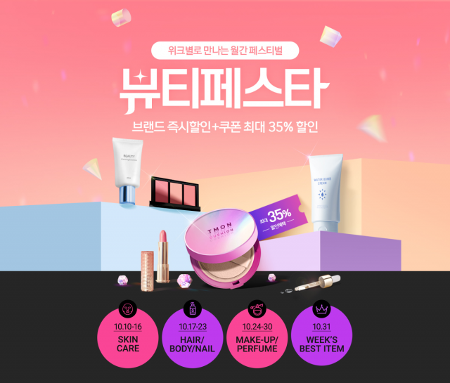 △티몬이 31일까지 뷰티 상품만을 큐레이션해 선보이는 월간 프로모션, '뷰티페스타'를 열고, 매주 다른 뷰티 카테고리의 인기 상품들을 최대 35% 추가 할인 혜택을 더해 선보인다. 아모레퍼시픽, 미샤, 에뛰드 등 주요 뷰티 브랜드의 300여 인기상품들을 한 눈에 볼 수 있다. 선착순 25% 할인에 브랜드별 10% 내외의 즉시 할인까지 중복 적용 가능해 인기 뷰티 아이템들을 초저가에 구매할 수 있다. 10일부터 시작되는 뷰티페스타 1주차에는 건조한 가을 날씨에 대비한 스킨케어 상품들을 엄선했다. 온라인 판매가 2만~3만 원대인 ▲이니스프리 그린티 밸런싱 세트와 ▲에스트라 아토베리어365 캡슐크림은 최종혜택가 1만 원대다. 프랑스산 라벤더 꿀을 함유한 ▲르미엘 기미개선 캡슐 앰플은 9000원대, ▲동국제약 센텔리안24 마데카크림은 2000원대 가격으로 만나볼 수 있다. 뷰티페스타 2·3주차에도 풍성한 핫딜로 특가 라인업을 구성할 계획이다. 17일부터는 헤어·바디·네일 특가 상품, 24일부터인 3주차에는 향수·메이크업 제품과 남성 뷰티 소품을 특가 판매한다. 10월 뷰티페스타의 마지막 날인 31일에는 각 주차별 베스트 아이템만을 모은 특별 판매를 진행한다. 하이라이트는 매일 오전 7시와 오후 6시 두차례 제공하는 선착순 장바구니 할인 쿠폰이다. 구매 금액에 따라 최대 2만 5000원까지 할인 가능해 장바구니에 담을수록 큰 할인을 누릴 수 있다. 이밖에도 2만 원 이상 결제액에 10~15%의 할인 쿠폰 등 소액·소량의 제품 구매 시에도 뷰티페스타의 풍성한 혜택을 이용할 수 있다. 10일 티몬의 주간 최대 할인 행사인 '티몬데이'에서도 다채로운 뷰티 특가 상품을 만나볼 수 있다. ▲그린티 밸런싱 스킨케어세트를 비롯 ▲센카 퍼펙트휩 2종세트, ▲라네즈 아이래시컬러 등 뷰티 카테고리의 스테디셀러들을 하루 한정 제공되는 티몬데이 혜택을 더해 특가 구매할 수 있다.