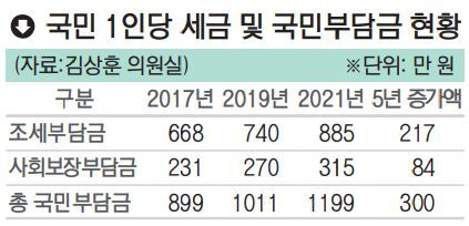 5년간 국민 1명 세금·연금·보험료 부담 300만원 증가