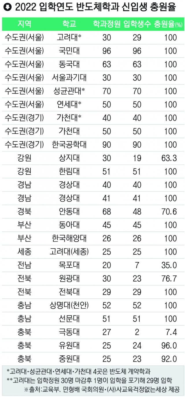 반도체학과 충원율 미달 사태를 겪은 지역대학을 보면 극동대(충북 소재)가 7.4%(27명 정원, 2명 입학)로 충원율이 최저치였고, 이어 목포대(전남) 35.0%(20명 정원, 7명 입학), 상지대(강원) 63.3%(30명 정원, 19명 입학), 안동대(경북) 70.6%(68명 정원, 48명 입학), 원광대(전북) 76.7%(30명 정원, 23명 입학), 중원대(충북) 92.0%(25명 정원, 23명 입학), 유원대(충북) 96.0%(25명 정원, 24명 입학) 순이었다.
