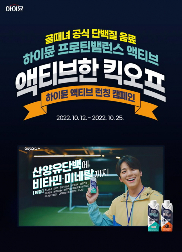 △일동후디스가 고단백 음료 '하이뮨 프로틴 밸런스 액티브' 음료 론칭을 기념해 '액티브한 킥오프' 캠페인을 진행한다. '스페셜 타임 어택 이벤트'와 '퀴즈 이벤트' 총 2가지로 구성된다. 이벤트는 네이버 검색창에 '하이뮨 액티브'를 검색해 상단에 노출되는 관련 이미지를 클릭해 참여할 수 있으며, 상세 참여 방법은 하이뮨 액티브 공식 인스타그램에서도 확인할 수 있다. 스페셜 타임 어택 이벤트는 12일 단 하루 진행되며, 최근 많은 이들의 응원과 사랑을 받고 있는 스포츠 예능 '골때리는 그녀들(골때녀)' 공식 단백질 음료인 하이뮨 액티브 편의점 교환권을 증정한다. 선착순 1만 명을 대상으로 골때녀가 방영되는 오후 9시부터 오후 11시 59분까지 진행된다. 두번째로 퀴즈 이벤트는 공식 하이뮨몰에서 하이뮨 액티브 TV CF영상을 본 후 퀴즈를 풀면 참여가 가능한 이벤트로 누구나 쉽게 참여할 수 있다. 정답자들 대상으로 추첨을 통해 아이패드 에어, 에어팟3세대 등 푸짐한 경품이 준비돼 있다.