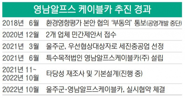 이 사업은 올해 6·1 지방선거 이후 국민의힘 소속 이순걸 군수가 취임하면서 재시동이 걸린 것이다. 이 군수는 “영남알프스케이블카 측의 타당성 조사 결과 지역경제 파급효과는 생산유발 740억 원, 부가가치 유발 267억 원, 고용유발 613명으로 지역경제에 미치는 파급 효과가 크다”고 주장했다.