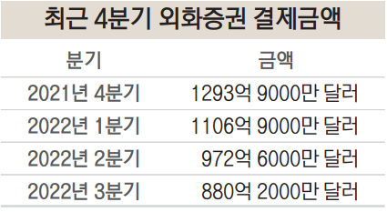 13일 한국예탁결제원에 따르면, 국내 투자자의 3분기 외화증권 결제금액은 880억 2000만 달러로 지난해 4분기 1293억 9000만 달러 이후 3분기 연속 하락세를 보이고 있다.