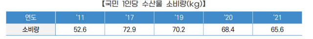 국민 1인당 수산물 소비량은 지속적으로 증가해 2017년 72.9kg, 2019년 70.2kg 등 2017년부터는 70kg을 넘어섰다. 이어 2020년 68.4kg, 2021년 65.6kg으로 최근 2년간 다소 주춤한 모습이지만, 2020년 이후에도 65kg 이상을 유지하고 있다.