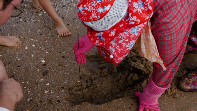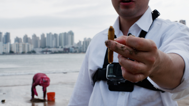 고수 옆에 자리 잡고, 땅을 파기 시작했다. 고수 근처에서 땅을 파면 쉽게 조개를 발견할 수 있을 것 같았다. 그러나 허탕이다. 오랫동안 광안리에서 조개를 채취해왔다는 그는 "지난번 태풍에 다 쓸려나가서 모시조개나, 개량조개를 발견하긴 어렵다"며 "맛조개를 노리는 게 좋다"고 말했다. 고수가 맛조개를 잡는 모습을 지켜봤다. 호미를 이용해 모래를 얕고 넓게 헤집었다. 파는 느낌이 아니라 헤집는 느낌이다. 그리고 맛조개 구멍을 발견하면, 바로 가느다란 쇠꼬챙이를 집어넣었다. 몇 번 구멍을 쑤시다가 재빨리 뽑아내니 갈고리처럼 휘어진 꼬챙이 끝에 맛조개가 걸려왔다.