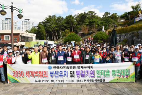 한국자유총연맹 연제구지회(회장 강생일)는 15일 연제문화체육공원에서 회원, 주민 300여 명이 참여한 가운데 2030 세계박람회 부산유치 및 통일기원 한마음 등반대회를 개최했다.