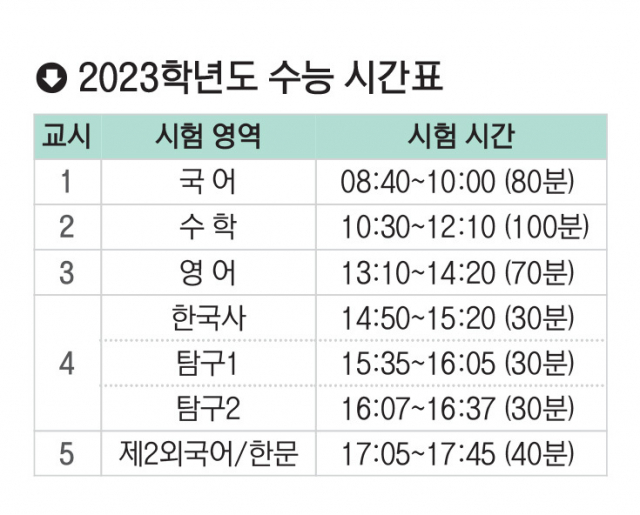 우선, 수험생들은 자신의 생체리듬을 수능 당일 시험시간표에 맞추는 것이 중요하다. 수능 입실시간은 오전 8시 10분까지이며 오전 8시 40분부터 1교시 국어영역(80분) 시험이 시작된다. 2교시 수학영역은 오전 10시 30분~오후 12시 10분(100분), 3교시 영어영역은 오후 1시 10분~2시 20분(70분), 4교시 한국사와 탐구영역은 오후 2시 50분부터 오후 4시 37분(과목별 30분)까지 진행된다. 한문·제2외국어를 응시하는 수험생은 오후 5시 45분까지 긴 시간 동안 시험을 쳐야 한다.