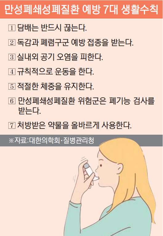 만성폐쇄성폐질환 환자의 치료에서 가장 중요한 것은 폐기능이 더 악화되는 것을 방지하는 것으로, 흡연자의 경우 즉각 담배를 끊는 것이 무엇보다 중요하다. 또 독감과 폐렴구균 예방 접종을 통해 미리 호흡기 감염을 예방하는 것도 중요하다. 이와 함께 황사나 미세먼지가 심할 때는 외출이나 야외 활동을 삼가는 것이 좋다.