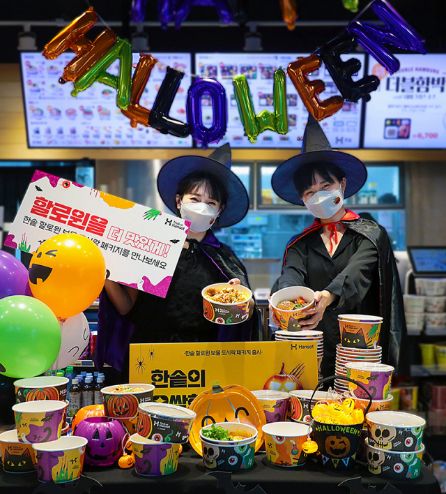 △도시락 프랜차이즈 한솥이 핼러윈 데이를 맞아 '오싹 핼러윈 보울 도시락 패키지'를 출시했다. 검은 고양이를 중심으로 오싹한 분위기를 자아내는 일러스트 요소들이 적용돼 핼러윈 데이의 으스스한 무드를 담아냈다. 어린이들이 초콜릿을 받기 위해 외치던 '트릭 오어 트릿(Trick or treats, 장난 혹은 선물)'을 '트릭 오어 한솥(Trick or Hansot)'으로 변형해 소소한 재미를 더했다. 잭오랜턴을 상징하는 호박 캐릭터를 KF94마스크에 더해 귀여운 느낌을 자아내는 굿즈도 마련했다. 한솥 핼러윈 마스크는 전체 가맹점의 점주에게 배포해 핼러윈 분위기를 한껏 끌어올리는 역할을 하게된다. 한솥 핼러윈 마스크는 오는 25일부터 31일까지 한솥 도시락 강남역점에서 배달의 민족으로 주문 후 정성스러운 리뷰 작성을 하면 경품으로 증정된다.