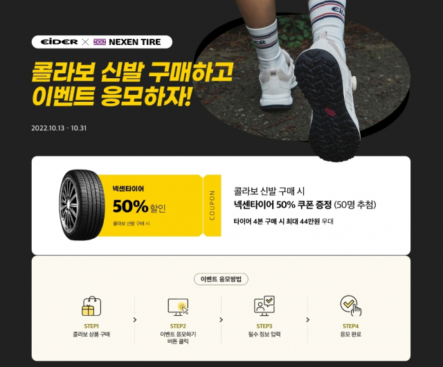 △아웃도어 패션 브랜드 아이더가 넥센타이어와 협업한 신개념 트레킹화 4종을 선보이며, 이를 기념하기 위한 특별 이벤트를 진행한다. 아이더와 넥센타이어가 협업한 트레킹화 4종(샬레 하이브 TT, 라이트 하이크 TT, 노마드 라이트 TT, 퀀텀 네오 레더 TT)은 넥센타이어의 타이어 제조에 사용되는 테크 물성이 신발 밑창(아웃솔)에 그대로 적용돼 최상의 접지력을 선사하는 것이 특징이다. 타이어 제조 과정에서 발생되는 고무 부산물을 업사이클링해 친환경까지 고려했다는 점에서 의미가 크다. 우수한 접지력과 내마모성이 강한 타이어의 강점이 반영된 만큼 다양한 지형과 날씨 변화에도 흔들림없이 안정적인 아웃도어를 즐길 수 있다. 아웃솔 외에도 내구성이 뛰어난 고기능성 원단 '코듀라(CORDURA)'가 적용돼 안전하고 편안한 활동성을 제공한다. 대표 제품인 노마드 라이트 TT는 경량의 미드컷 등산화다. 천연 스프리트 가죽과 쿠셔닝이 업그레이드된 엑스폼(X-FOAM) 미드솔의 적용으로 편안한 착용감을 선사한다. 색상은 라이트 브라운과 블랙 두 가지로 만나볼 수 있다. 라이트 하이크 TT는 메쉬와 합성가죽 소재의 조합으로 아웃도어 활동은 물론 일상에서도 폭넓게 활용할 수 있는 가성비가 우수한 트레킹화다. 신발 끈 없이 발의 피팅감을 균형 있게 조절할 수 있는 보아 핏 시스템이 장착돼 있다. 출시를 기념해 이벤트도 마련됐다. 아이더X넥센타이어 트레킹화 4종을 구매한 이들을 대상으로 추첨을 통해 넥센타이어 50% 할인 쿠폰을 증정한다. 타이어 4본 구매 시 최대 44만 원의 우대혜택을 누릴 수 있다. 구매 영수증 혹은 공식몰 주문 번호로 응모할 수 있다. 총 50명을 추첨하며, 당첨자에게는 '넥센타이어 넥스트레벨'에서 사용 가능한 쿠폰을 지급한다. 이벤트 참여는 오는 31일까지 아이더 공식몰을 통해 가능하며, 당첨자는 11월 중순 발표될 예정이다.