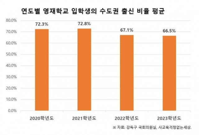최근 몇 년간 전국 영재학교의 수도권 출신 비율은 2020학년도 72.3%, 2021학년도 72.8%, 2022학년도 67.1% 등 전반적인 감소 추세에도 불구하고 여전히 높은 실정이다.