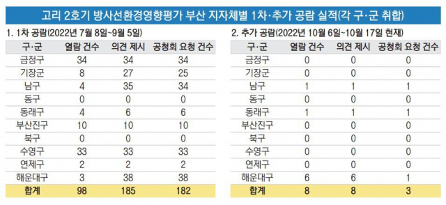 내년 4월 설계수명이 만료되는 고리원전 2호기의 수명 연장을 위해 진행 중인 방사선환경영향평가서의 주민 추가 공람도 1차 때(부산일보 8월 23일 자 3면 등 보도)와 마찬가지로 형식적으로 진행되는 것으로 드러났다. 1차 공람처럼 주민들이 구·군청을 직접 찾아가 전문적인 내용으로 채워진 수백 쪽의 문서를 직접 읽어야 하는 것은 물론 온라인에서 문서를 내려받을 수 없는 불편함이 여전했다.