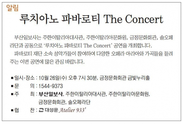 부산일보사는 주한이탈리아대사관, 주한이탈리아문화원, 금정문화회관, 솔오페라단과 공동으로 '루치아노 파바로티 The Concert' 공연을 개최합니다.