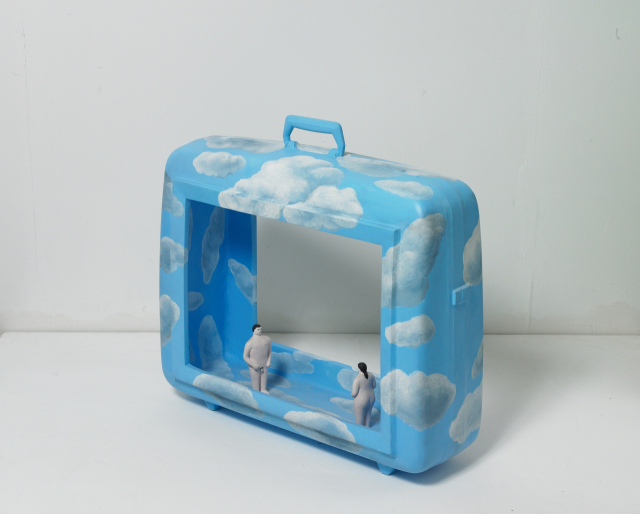 관통하는 사각 형태의 구멍 덕에 여행용 가방은 마치 액자 같다. 하늘색을 배경으로 구름이 구멍 뚫린 가방의 안팎을 가득 메운다. 이렇게 하늘을 무대로 한 ‘가방극장’ 안에는 한 쌍의 작은 남녀가 정면으로 마주 보고 서 있다. 다소 ‘둥글둥글’ 단순하게 조형되고 회색조로 칠해져 인위적인 느낌이 난다.