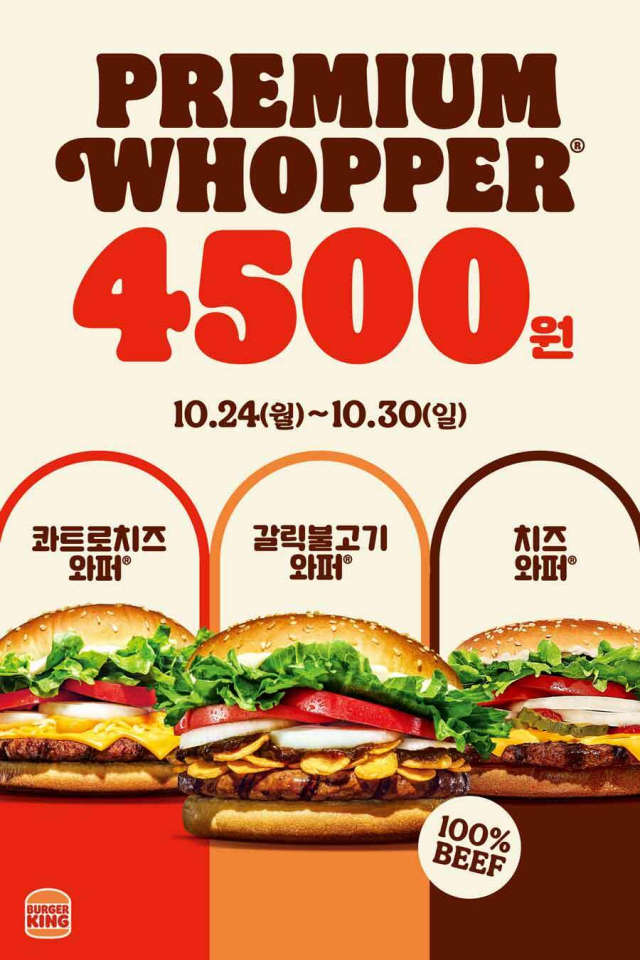 △프리미엄 햄버거 브랜드 버거킹이 24일부터 30일까지 버거킹의 프리미엄 와퍼를 4500원에 만나볼 수 있는 프로모션을 진행한다. 프로모션 대상 제품은 와퍼 베스트셀러인 '콰트로치즈와퍼', '갈릭 불고기와퍼'와 '치즈와퍼'다. 콰트로치즈와퍼는 파르메산, 아메리칸, 모짜렐라, 체다의 4가지 치즈와 불에 직접 구운 100% 순 쇠고기 패티가 고급스러운 풍미를 자랑한다. 한국인 입맛 특색에 맞춰 버거킹 코리아에서 개발한 콰트로치즈와퍼는 각기 다른 맛을 지닌 치즈들이 선사하는 특별한 풍미로 출시 한 달 만에 판매량 100만 개를 돌파하기도 했다. 갈릭 불고기와퍼는 버거킹의 노하우로 한국의 맛을 재해석한 메뉴로, 감칠맛을 살린 달콤한 불고기 소스에 바삭한 갈릭칩을 더해 맛과 식감 모두를 즐길 수 있다. 치즈와퍼는 직화로 구운 순 쇠고기 패티에 치즈를 2장 더한 고소하고 담백한 맛으로, 햄버거의 클래식한 맛을 가장 잘 느낄 수 있는 메뉴다. 이번 프로모션은 딜리버리와 일부 매장을 제외한 전국 버거킹 매장에서 진행되며, 다른 할인·쿠폰과 중복 혜택 적용은 불가능하다.