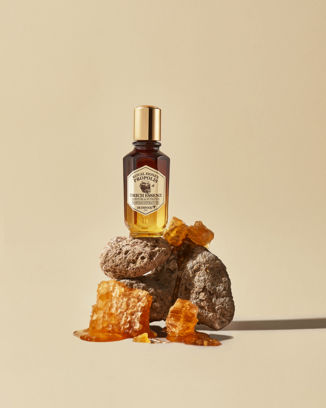 로열허니 프로폴리스 인리치 에센스는 정제수 대신 블랙비 프로폴리스 추출물 63%, 로얄 젤리 추출물 10%, 꿀 추출물 10%를 담아 더 높아진 함유량, 더 진해진 영양감으로 피부 장벽 강화에 도움을 준다. 밀도 높은 고농축 텍스처가 피부에 쫀쫀하게 밀착돼 속부터 켜켜이 채워지는 보습력을 전달하며 차오르는 수분감을 느낄 수 있다.