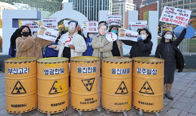 탈핵부산시민연대를 비롯한 전국 탈핵 운동 시민사회단체 회원들이 24일 서울 중구 서울시청 앞에서 전력 소비가 많은 서울시와 경기도에 고준위 핵폐기물 책임을 촉구하는 기자회견을 열었다. 연합뉴스