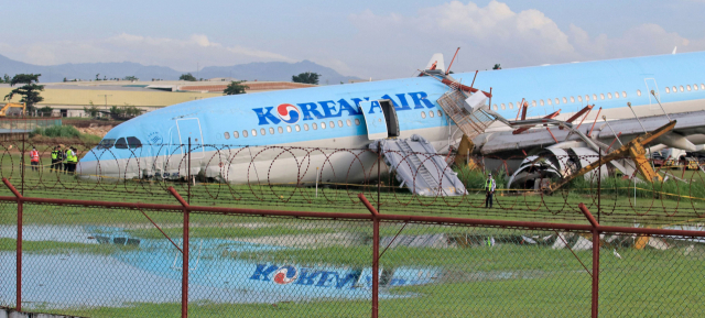 24일 필리핀 세부 막탄공항에서 활주로를 이탈한 대한항공 여객기가 바닥에 처박혀 있다. 173명이 탑승한 여객기는 기상 악화로 2차례 착륙 실패 이후 3번째 시도 끝에 착륙 후 활주로를 이탈하는 사고가 발생했다. 당국은 탑승자 전원이 무사하다고 밝혔다. AP연합뉴스