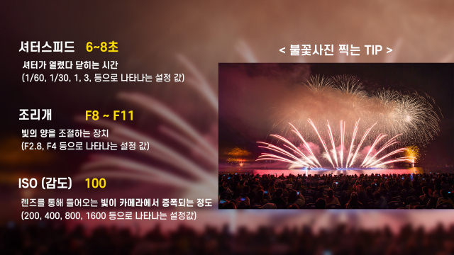 두 번째 고민은 바로 '사진'. 1년에 한 번뿐인 불꽃 이쁘게 찍고 싶은데, 왜 내가 찍은 사진은 엉망진창일까? 스마트폰으로는 불꽃을 찍기 어려운 걸까? 고가의 전문 DSLR 카메라를 마련해야 하는 걸까?