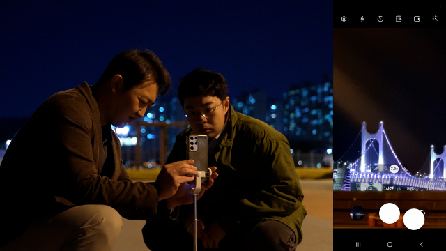 직접 한번 찍어봤다. 숨을 참고 찍었는데도, 손이 흔들려 제대로 된 사진을 찍을 수 없었다. 셔터스피드를 길게 주다 보니, 노출도 날아가 너무 밝은 사진이 찍혔다. 김 기자는 노출을 잘 잡을 수 있는 노하우를 알려줬다. 그는 "본격적인 불꽃축제를 시작하기 전 테스트용으로 몇 발의 불꽃을 쏜다"며 "그때 사진기자들도 저마다 노출을 잡고 구도를 잡는다"고 말했다. 그러면서 "나는 보통 8초 정도를 잡는데, 이렇게 두면 불꽃이 하늘로 쏘아져 올라가는 궤적과 불꽃이 터지는 장면을 한 번에 찍을 수 있다"고 했다.