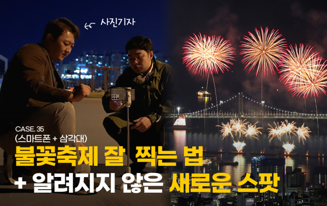 사진기자들이 선호하는 장소는 금련산청소년수련원 안에서도 생활관 앞 공터와 당일 한정 프레스에만 오픈되는 생활관 옥상 등이다. 공터에 자리를 잡고 불꽃 사진을 잘 찍을 수 있는 비결을 물어봤다. 김 기자는 "제가 전문가는 아니지만, 무엇보다 중요한 것은 흔들리지 않는 거다"라며 "스마트폰으로 많이 촬영하실 텐데, 삼각대가 크고 무거운 게 결과물이 좋다"고 했다. 이어 "그날은 사람들이 많기 때문에 나무덱보다 아스팔트에 삼각대를 펼치는 게 흔들림이 적다"고 했다.
