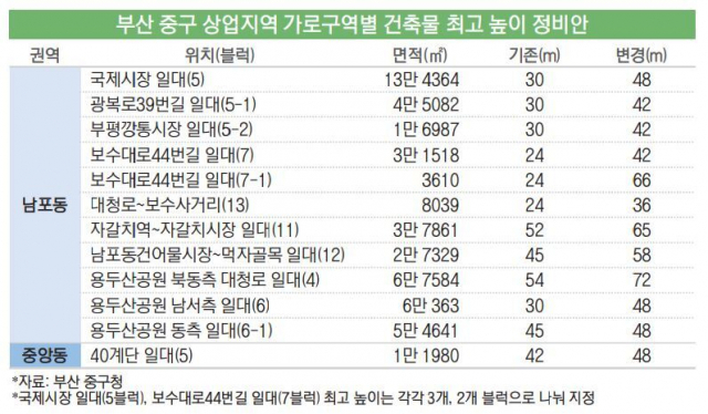 이번 정비로 최고 높이가 상향되는 구역은 남포동과 중앙동의 9개 블록이다. 정비 과정에서 일부 블록이 세분화되면서 총 13개 블록에 새롭게 최고 높이가 지정됐다. △보수대로44번길 일대(24→66m) △국제시장 일대(30→48m) △용두산공원 북동 측 대청로 일대(54→72m) △용두산공원 남서 측 일대(30→48m) 등이 큰 상승폭을 보였다.