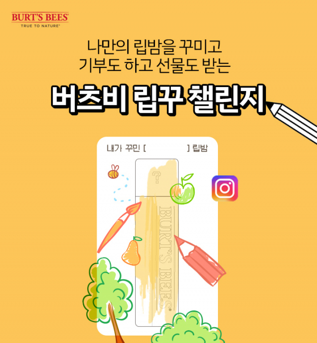 △내추럴 스킨케어 브랜드 버츠비가 11월 15일까지 '버츠비 립꾸 챌린지 이벤트'를 버츠비 코리아 공식 인스타그램·네이버 웹툰 쿠키오븐에서 진행한다. 버츠비 코리아 공식 인스타그램 피드·스토리, 하이라이트에 업로드된 '립꾸(립밤 꾸미기)' 시안을 캡쳐해 참여할 수 있다. 캡쳐한 버츠비 립꾸 시안을 인스타그램 스토리 내, 혹은 사진 어플, 메모장 등에서 다양한 방법으로 자유롭게 꾸민 뒤 필수 해시태그와 함께 버츠비 코리아 공식 인스타그램 계정을 언급해 자신의 인스타그램 피드 또는 스토리, 릴스에 게시하면 자동으로 이벤트 참여가 가능하다. 이벤트 참여자 200여 명 이상에게 경품을 증정한다. 먼저 우수작으로 선정된 10개의 립꾸 시안은 버츠비 코리아 공식 인스타그램에 게재되며 투표를 통해 버츠비 상(1등 1명), 퀸비 상(2등 3명), 범블비 상(3등 6명)로 최종 순위가 결정된다. 1등에게는 90만 원 상당의 아이패드 에어 5세대가 증정되며 2등에게는 20만 원 상당의 폴라로이드 나우, 3등에게는 네이버 페이 10만 원 상품권이 증정된다. 허니비 상(200명) 해당자 중 88명에게는 버츠비 립밤 2종(랜덤)이 증정되며 112명에게는 올리브영 1만 원 상품권이 경품으로 지급될 예정이다. 이벤트 참여자 수만큼 취약 계층 어린이에게 립밤 기부도 진행할 계획이다.