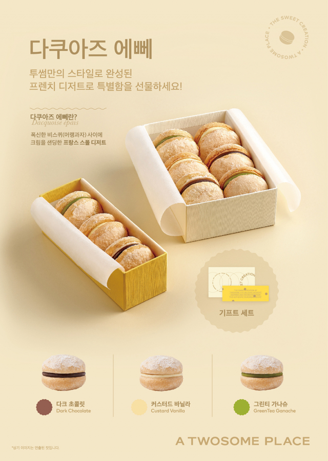 △프리미엄 디저트 카페 투썸플레이스가 프렌치 디저트 '다쿠아즈 에뻬(Dacqoise épais) 3종'을 출시한다. 머랭에 아몬드 가루와 슈가 파우더를 넣어 구워낸 ‘비스퀴’ 사이에 크림을 채운 프랑스 정통 디저트 '다쿠아즈'를 투썸만의 스타일을 더해 완성한 제품이다. 도톰한 비스퀴로 부드럽고 폭신한 식감을, 진하고 크리미한 필링으로 입안 가득 풍부한 맛을 선사한다. '커스터드 바닐라', '다크 초콜릿', '그린티 가나슈' 3가지 맛으로 출시된다. ▲커스터드 바닐라 다쿠아즈 에뻬는 달콤한 풍미의 바닐라 크림이 더해져 풍부한 맛과 향을 느낄 수 있다. ▲다크 초콜릿 다쿠아즈 에뻬는 달콤 쌉싸름한 다크 초콜릿과 부드러운 생크림의 조화로운 맛이 특징이다. ▲그린티 가나슈 다쿠아즈 에뻬는 진한 국내산 녹차 크림과 달콤한 화이트 초콜릿이 잘 어우러진 제품이다. 기프트 세트로도 만나볼 수 있다. 3가지 다쿠아즈 중 원하는 맛의 제품을 선택해 3 개입 또는 6개입으로 구성할 수 있다. 고급스러운 전용 패키지에 담아 감사의 마음을 전할 수 있도록 준비된 제품이다.