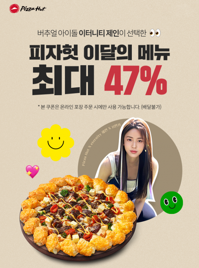 △한국피자헛이 26일 오후 9시부터 1시간 동안 가상 인간 아이돌 '제인'과 함께 피자헛 인기 메뉴를 최대 47% 할인가에 만나볼 수 있는 11번가 라이브 커머스 방송을 진행한다. 피자헛은 이번 라이브 커머스를 통해 립스테이크 골드바이트, 케이준더블쉬림프 치즈크러스트, 수퍼슈프림 리치골드와 같은 피자헛만의 프리미엄 피자 메뉴들과 가볍게 즐기기 좋은 씬메가크런치 2종 등이 포함된 총 5종의 다양한 세트를 선보인다. 5종 모두 피자 라지 사이즈에 음료와 사이드 메뉴가 더해진 알찬 구성으로 준비했다. 립스테이크 골드 바이트 세트의 경우, 허니갈릭 옥수수와 콜라가 포함된 구성으로 정상가 대비 47% 할인된 가격에 만나볼 수 있다. 11번가 라이브 방송을 통해 소개된 피자 세트메뉴 5종은 방송이 끝난 이후에도 구매 가능하며 오는 30일까지 한정 판매된다. 이번 라이브 커머스는 세계 최초 버추얼 휴먼 아이돌 '이터니티'의 제인이 참여해 생방송으로 가상 인간 먹방을 진행할 예정이며, 아이돌 댄스와 게임에 참여하는 등 다양한 콘텐츠를 선보일 예정이다.