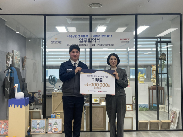 ㈜정현전기물류(대표 오상훈)는 부산문화재단(대표이사 이미연)과 부산 문화예술 발전을 위한 업무협약을 26일 체결하고, 재단에 매년 500만 원을 기부하기로 했다.