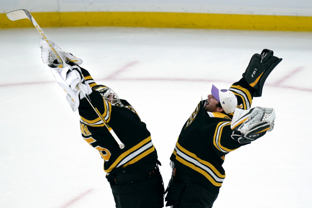 26일(한국시간) 미국 매사추세츠주 보스턴에서 열린 2022-2023 북미프로아이스하키(NHL) 보스턴 브루인스와 댈러스 스타즈의 경기에서 보스턴의 골텐더(골리) 리누스 울마크(왼쪽)와 동료 제레미 스웨이먼이 승리 세리머니를 하고 있다. 보스턴이 댈러스에 3-1로 이겼다. AP연합뉴스