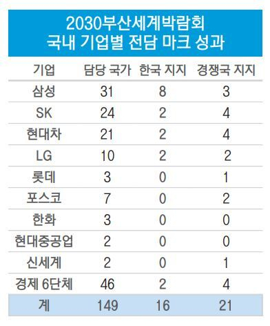 〈부산일보〉는 2030년 세계박람회 유치국 결정을 1년여 앞두고 정부가 파악 중인 대한민국 지지 국가 16개 가운데 기업별 성과를 분석해 봤다.