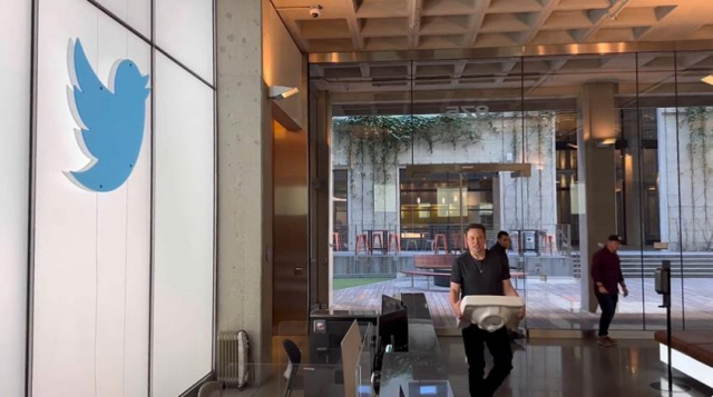 트위터 인수를 앞둔 일론 머스크 테슬라 CEO가 26일 샌프란시스코 트위터 본사에 세면대를 들고 출근하고 있다. 이날 트위터에 sink(세면대)를 써 ‘Let that sink in’라고 글을 남겼는데 “불편하더라도 들어갈 테니 이해를 바란다”는 의미로 해석된다. 연합뉴스