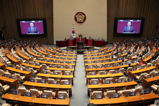 내년 나라 살림도 초장부터 파장 분위기가 연출됐다. 25일 국회에서 있은 윤석열 대통령의 첫 시정연설이 제1야당인 더불어민주당 의원들의 전원 불참으로 얼룩졌다. 1987년 개헌 이후 첫 ‘반쪽 시정연설’로 헌정사에 기록될 전망이다. 여야가 639조 원 규모의 내년 예산안 심사를 위한 일정에 합의하기는 했다지만 예산 정국의 서막이랄 수 있는 시정연설조차 극심한 정쟁 끝에 파행을 겪은 터라 험난한 여정을 예고한다.