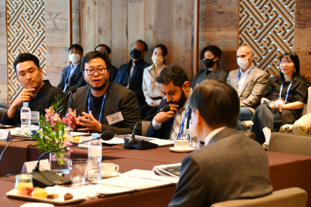 27일 오전 부산 해운대 파크하얏트 호텔에서 열린 ‘국내외 거래소 라운드 테이블’ 행사 중 박형준(뒷모습) 부산시장이 해외 가상자산거래소 관계자의 이야기를 듣고 있다. BWB 사무국 제공