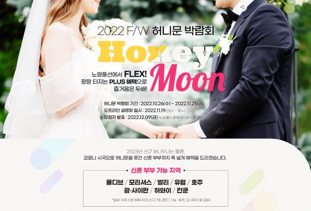 △노랑풍선은 허니문을 꿈꾸는 예비부부와 신혼부부를 위한 '2022 FW 온오프라인 허니문 박람회'를 개최한다. 내달 25일까지 자사 홈페이지에서 열리며, 내달 19일 오전 9시부터 오후 6시까지 노랑풍선 본사 사옥 VIP룸에서 허니문 전문 담당자와 오프라인 1:1 맞춤 상담도 함께 진행된다. 오프라인 상담을 원하는 고객은 자사 홈페이지 내 기획전 카테고리 2022 F/W 허니문 박람회 상세 페이지에서 원하는 일정과 국가, 예산 등을 입력하면 된다. 자세한 상담 일정은 담당자가 개별 안내할 예정이다. 주목할 점은 내년에 여행을 계획하고 있는 예비부부뿐만 아니라 코로나19로 인해 약 2년간 허니문을 가지 못한 신혼부부에게도 풍성하고 다양한 혜택을 준다는 점이다. ▲몰디브 ▲모리셔스 ▲발리 ▲유럽 ▲호주 ▲괌/사이판 ▲하와이 ▲칸쿤 등 다양한 지역별 상품을 선보이며 선택의 폭을 넓히고, 평생 한 번뿐인 허니문의 추억을 아름답게 쌓을 수 있도록 구성한 것이 특징이다. 박람회 기간 동안 예약·결제하는 고객에게는 ▲신한카드로 300만 원 이상 결제 시 20만 원 즉시 할인(31일까지 선착순 100커플) ▲신라면세점 쿠폰/적립금/포인트(지점별 상이) ▲캐리어 세트·소형 인덕션 ▲와이파이도시락 15% 할인 ▲허니문 전용 국내 호텔 9%·제주도 렌터카 7% 할인 쿠폰(최대 10만 원) 등 놀라울 만큼 특별하고 풍부한 특전을 제공한다. 지역별, 상품별 예약자를 위해 ▲스위스 융프라우 등정권(2팀 추첨)·스냅 촬영(유럽) ▲투어·관광지 교통 티켓(하와이/칸쿤) ▲리조트별 추가 할인(동남아) ▲현지 와인·식사 업그레이드(호주) 등 알차고 실속 있는 여행지 맞춤형 추가 혜택도 마련했다. 경품 추첨·할인 이벤트 당첨자는 12월 9일 개별 연락을 통해 발표할 예정이다.