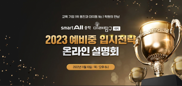 △웅진씽크빅은 11월 10일 '2023 예비중 입시전략 온라인 설명회'를 개최한다. 중등인강 '웅진스마트올중학'과 대치 유명 학원 '미래탐구'가 함께 마련하는 이번 설명회에서는 미래탐구 대치의 조준용 대표 원장과 타임교육 이해웅 입시연구소장이 발표에 나선다. 예비 중학생 학부모를 대상으로 2025년 전면 시행하는 고교학점제 대비법 등 변화하는 교육 정책·입시 현황을 소개하고, 성공적인 대학 입시 준비를 위한 다양한 정보를 공유한다. 11월 9일까지 신청 가능하며, 해당 기간에 웅진스마트올중학 상품에 가입하는 신규 회원에게는 대치동 학원 자체 제작 교재를 무료 증정한다. 기존 회원은 별도 신청 없이 제공되는 입장 URL을 통해 설명회에 참가할 수 있다. 웅진스마트올중학에서는 대치동 유명 학원인 미래탐구, 깊은생각, ILE 어학원의 수업을 그대로 담은 '대치TOP' 강의를 제공하고 매년 교육, 입시 전문가를 초청한 설명회를 개최해 학부모에게 교육정보를 소개한다. 신규 회원 가입·설명회에 대한 자세한 내용은 홈페이지에서 확인할 수 있다.