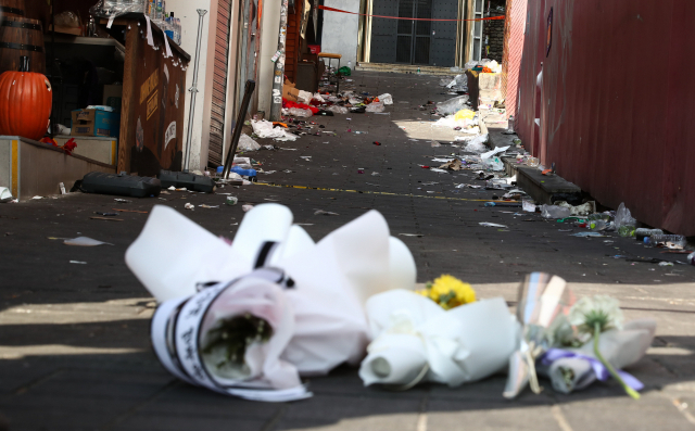 30일 서울 용산구 이태원로 일대에서 발생한 핼리윈 대규모 압사 참사 현장 앞에 희생자들을 추모하는 꽃다발이 놓여 있다. 김종호 기자 kimjh@