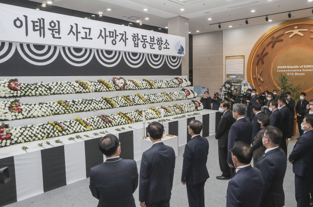 31일 오후 부산시청에 설치된 이태원 사고 사망자 합동분향소에서 박형준 부산시장 등 간부 공무원들이 합동분향하고 있다. 연합뉴스
