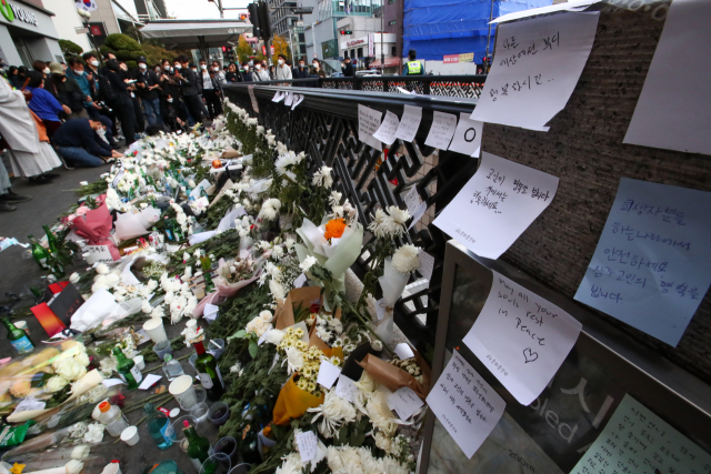 31일 오후 서울 용산구 이태원역 1번 출구 앞에 마련된 이태원 참사 희생자 추모 공간에 추모의 꽃과 메모들이 놓여 있다. 김종호 기자 kimjh@