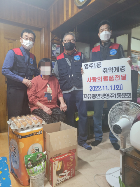 부산 중구 한국자유총연맹 영주1동분회(회장 이균홍)는 지난 1일 관내 거주 취약계층 독거노인 5세대를 방문하여 사랑의 물품(라면 20개, 롤휴지, 초코파이, 세제, 달걀 1판)을 전달했다.