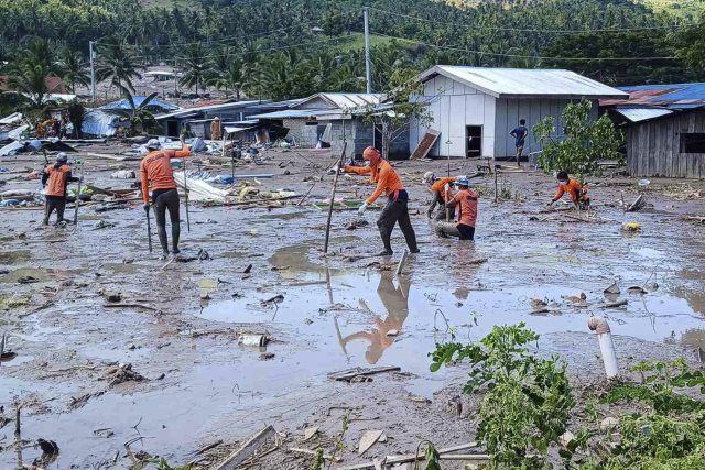 필리핀 해양경비원들이 지난달 31일 다투오딘신수아트 한 진흙더미에서 막대기로 태풍에 휩쓸린 실종자를 찾고 있다. 필리핀에서는 제22호 태풍 날개로 101명이 숨지고 66명이 실종됐다. AP연합뉴스