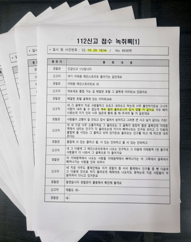 해당 신고자는 “지금 너무 소름 끼친다. 그 올라오는 그 골목이 굉장히 좁은 골목인데 이태원역에서 내리는 인구가 다 올라오는데, 거기서 빠져나오는 인구와 섞이고 그다음에 클럽에 줄 서 있는 그 줄하고 섞여 있다”고 말했다. 이 신고자의 전화를 받은 경찰관도 ‘압사’ 등의 표현을 되뇌며 사안의 심각성을 공유했다. 경찰관은 “사람들이 교행이 잘 안되고 압사, 밀려서 넘어지고 그러면 큰 사고 날 거 같다는 거죠”라고 되물은 것으로 확인됐다.
