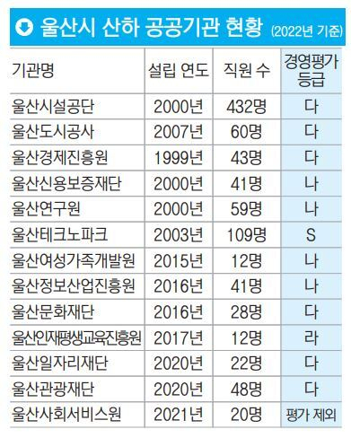 울산시 관계자는 “이르면 내년 2월 안에 공기관 통폐합 작업을 마무리할 계획”이라며 “추가 구조개혁에 들어갈 여지도 있다”고 밝혔다.