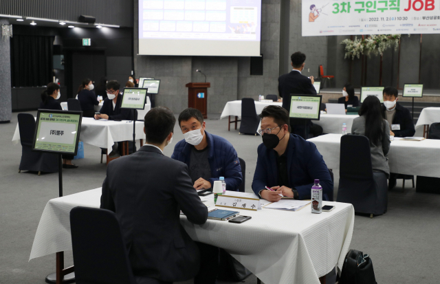 부산상공회의소가 주최한 '제3차 구인·구직 JOB 매칭 데이'가 2일 부산상공회의소 상의홀에서 열렸다. 15개 기업이 기계설계, 품질관리, IT 관련 분야에서 인력을 모집했다.