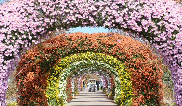 6일 경남 거창군 거창창포원을 찾은 방문객들이 국화 터널을 오가며 가을 분위기를 한껏 즐기고 있다. 거창군 제공