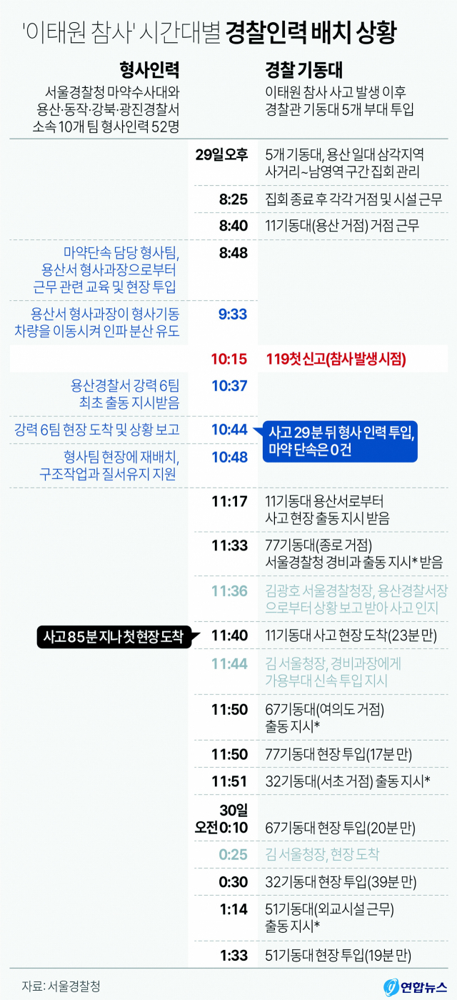 6일 서울경찰청이 더불어민주당 이태원 참사 대책본부에 제출한 자료에 따르면 참사가 발생한 지난달 29일 오후 10시 15분 이후 경찰 기동대는 사고 발생 1시간이 지난 이날 오후 11시 40분 처음 현장에 도착했다. 참사 당일 11기동대는 참사 발생 이후 1시간 2분이 흐른 오후 11시 17분 용산경찰서로부터 처음 출동 지시를 받고 오후 11시 40분 현장에 도착한 것으로 확인됐다. 당시 11기동대는 용산 일대에서 열린 집회관리에 투입됐다가 출동 지시를 받고 급히 현장에 투입됐다. 뒤이어 4개 기동대가 출동지시를 받고 뒤늦게 현장에 투입됐다.