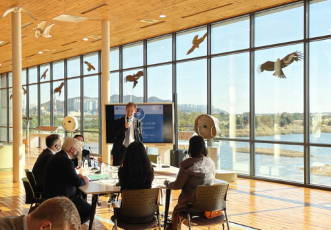 기초과학연구원(IBS, 원장 노도영)은 지난 5일(토) 오후 부산 낙동강하구에코센터에서 프랑크-발터 슈타인마이어 독일 대통령과 함께 ‘한-독 기후 라운드테이블’을 개최했다. 주한 독일대사관과 IBS 기후물리 연구단(단장 악셀 팀머만 부산대학교 석학교수)의 공동주최로 마련된 이번 라운드테이블에는 IBS 연구단 뿐 아니라 독일 포츠담 기후영향연구소(PIK), 기후변화청년단체 ‘긱(GEYK)’ 등 한국과 독일 기후변화 전문가들이 참여해 글로벌 기후 위기의 현주소를 살피고, 협력 방안을 논의했다.