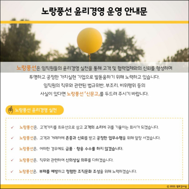 노랑풍선은 올해부터 협력사 계약서에 관련 조항을 추가했으며, 계약 체결 시 청렴확약서를 받아 윤리경영 실천을 공고히 할 예정이다.