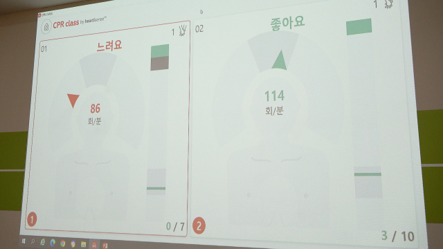과거 CPR 교육에서 가장 헷갈렸던 부분이 압박 강도다. 얼마만큼 강하게 또는 약하게 해야 하는지 가늠하기 어려웠다. 하지만 119안전체험관에서는 센서가 내장된 심폐소생 실습용 마네킹을 압박하면, 모니터를 통해 적정 압박 강도를 실시간으로 확인할 수 있다. 압박 강도가 약하면 '약해요', 느리면 '느려요' 압박 강도와 횟수가 모두 적절하면 '좋아요'라고 표시됐다. 생각보다 '좋아요' 표시를 띄우는 게 어려웠다.