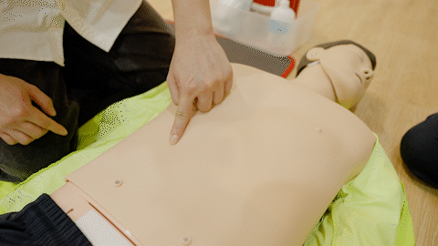 이 부분 역시 달라진 부분이다. 과거에는 쓰러진 사람의 양쪽 젖꼭지를 연결하는 가상의 선을 긋고, 그 선의 가운데를 압박하라고 교육했다. 김 소방관은 "사람마다 젖꼭지의 위치가 다르기 때문에 정확한 곳을 압박하기엔 어려움이 있어 달라졌다"며 "갈비뼈를 따라 움푹 들어간 명치를 찾은 다음, 명치에서 목 쪽으로 손가락 두 마디를 대고 반대편 손꿈치를 올려놓은 손가락 옆에 붙이고 압박하면 된다"고 설명했다. 마네킹을 상대로 연습하는데 생각보다 압박 포인트를 찾는 게 쉽지 않았다.